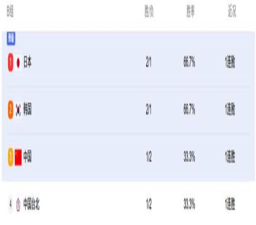 目前,B组的积分为:日本队5分第一名,韩国队5分第二名,中国队4分第三名,中国台北队垫底。
