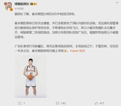 本赛季CBA第一阶段,广东队取得了17胜6负排名联盟第三,落后广厦队(19-4)和上海队(19-4);广东队第二阶段首个主场比赛于本月15日开打恰好对阵老冤家辽宁队,不出意外的话崔永熙会在该场比赛正式回归球场。