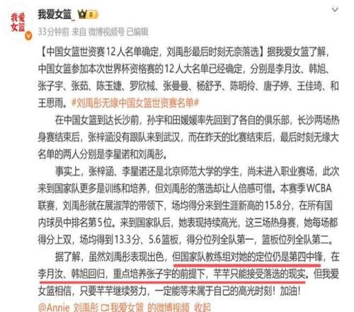 刘禹彤热身赛表现惊艳,也是最稳定的得分点。那么,为何刘禹彤落选12人名单?球迷一时想不通,都说他落选非常遗憾和可惜。最近媒体人“我爱女篮”对刘禹彤的落选进行了分析。他说虽然刘禹彤表现出色,但国家队教练组对她的定位仍是第四中锋,在李月汝、韩旭回归,重点培养张子宇的前提下,芊芊只能接受落选的现实。”从眼下实力来看,刘禹彤确实是强于张子宇,但是中国女篮着眼于培养张子宇,看好她的未来,所以刘禹彤只能定位第四中锋,被张子宇挤出局。