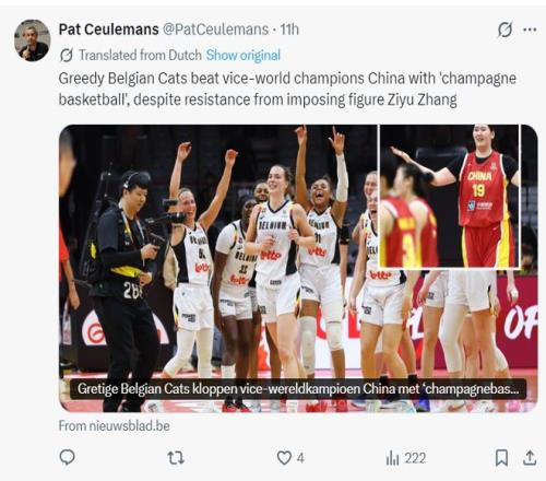 外媒写道:比利时女篮击败了前世界杯亚军中国队,虽然中国队的新星张子宇不答应打出不俗状态。