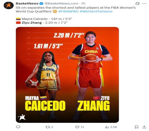 本届世预赛张子宇7尺2(2.2米)赛事第一,而委内瑞拉的卡伊赛多5尺3(1.61米)是赛会最矮。