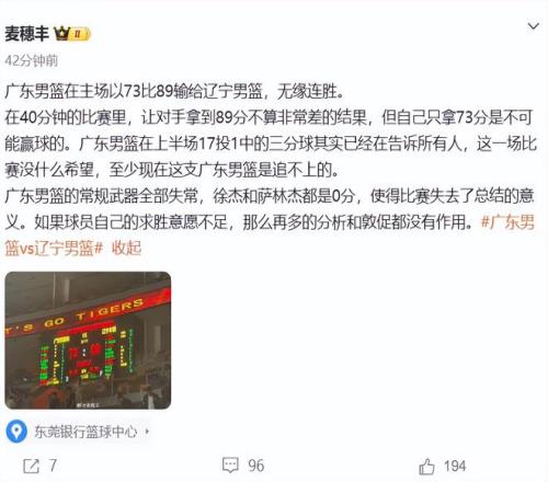 最后,再来看看广东媒体人的说法,麦穗丰认为是广东球员的求胜欲不足:广东男篮在上半场17投1中的三分球其实已经在告诉所有人,这一场比赛没什么希望,至少现在这支广东男篮是追不上的。广东男篮的常规武器全部失常,徐杰和萨林杰都是0分,使得比赛失去了总结的意义。如果球员自己的求胜意愿不足,那么再多的分析和敦促都没有作用。