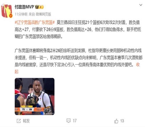 付政浩也针对广东内线的孱弱发表了看法,把输球的部分原因归结于徐昕的离队:莫兰德战旧主狂揽21个篮板6次助攻2次封盖,胜负值高达+27,付豪砍下26分9篮板,胜负值高达+26,他们打得如鱼得水,联手把纸糊的广东男篮禁区给凿得稀碎。广东男篮休赛期将身高2米26的徐昕送到龙狮,杜指导更擅长使用那种机动性内线来提速,但有一说一,机动性内线的优缺点向来鲜明,广东男篮本赛季几次溃败都是内线被凿穿,还是尽快下定决心引入一位具有身高体重优势的内线外援吧。