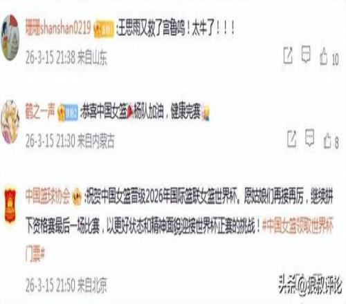 中国篮协官方发文:祝贺中国女篮晋级2026年国际篮联女篮世界杯。愿姑娘们再接再厉,继续拼下资格赛最后一场比赛,以更好状态和精神面貌迎接世界杯正赛的挑战。