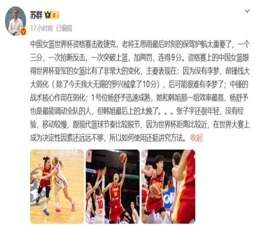 赛后,媒体人苏群在点评中国女篮时,直接点名对张子宇的看法。苏群表示:“张子宇还很年轻,没有经验,移动较慢,跟现代篮球节奏比较脱节,因为世界杯距离比较近,在世界大赛上成为决定性因素还远远不够,所以如何使用还挺讲究方法。”