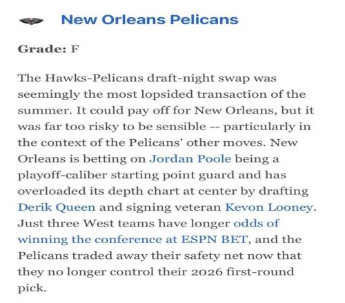 在当时,ESPN给出的休赛期操作评价里,鹈鹕是唯一一支得到F的球队,其中很大一部分原因就是因为这笔让人“匪夷所思”的交易。