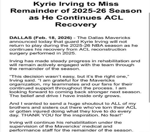 北京时间2月18日,当名记Shams报道表示,欧文本赛季不会复出,随后独行侠官方确认,欧文将于2026-27赛季复出回归赛...