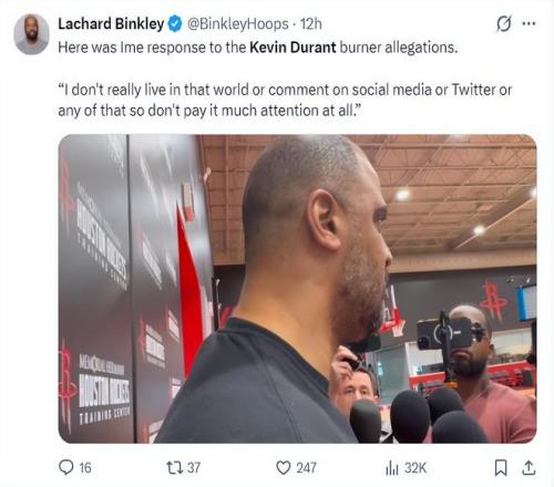 伊曼-香波特也谈到‘KD疑似小号风评’,他倡议大家回归赛场本身,他说道:归根结底,你们应该回归他的赛场表现,他依然有着7尺的身高还能投篮,来让我们看看真正的重要东西吧。