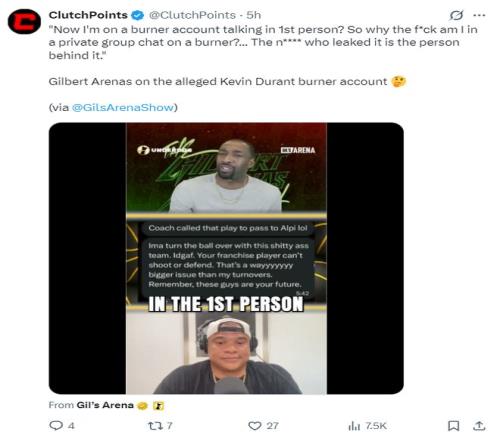 阿里纳斯也谈到了‘疑似杜兰特小号风波’,他说道:太扯淡了,我用小号的话还用第一人称?那我为什么还要切换小号呢?很明显说那个账号是杜兰特小号的家伙就是幕后黑手。