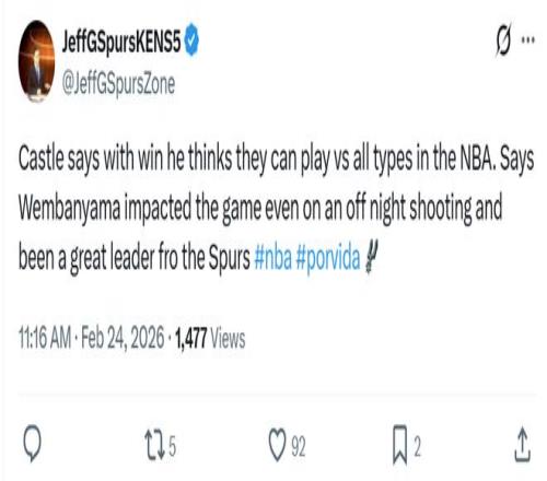 文班则认为本场击败联盟第一活塞是团队的胜利,每个人都在这场比赛中有所贡献,同时本场胜利是马刺证明自身实力和取得进步的重要时刻。