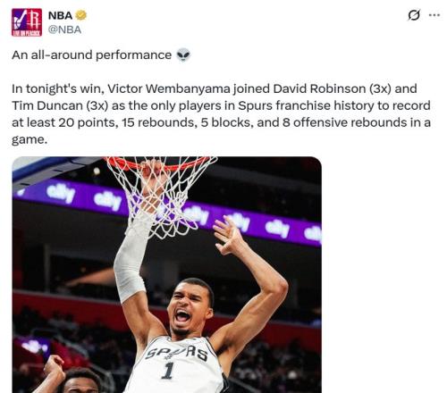 凭借这样的表现,文班成为马刺队史第三位单场至少拿下20分15板8前场板5帽的球员,前两人是大卫罗宾逊与邓肯。