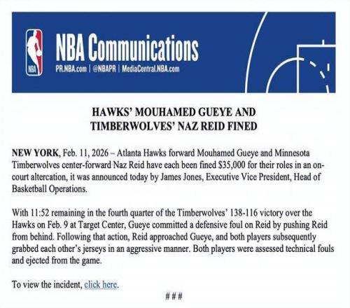 北京时间2月12日,NBA今日官方宣布,对森林狼内线纳兹-里德与老鹰前锋穆罕默德-盖耶各处以35,000美元罚款,原因是两人在周二老鹰主场的比赛中发生场上冲突。