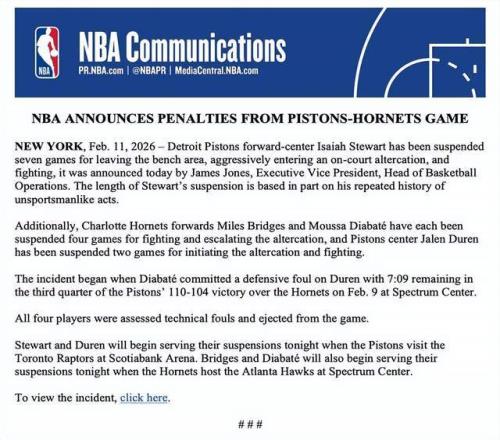 此前,NBA官方还公布了另一张重磅罚单,对黄蜂vs活塞四人驱逐的大冲突进行处罚——