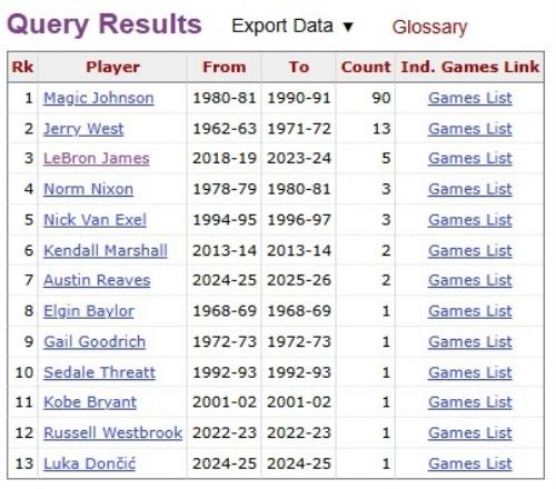 据统计,东契奇湖人生涯2次单场至少拿到20分15助攻,排名队史第6。榜单详情如下: