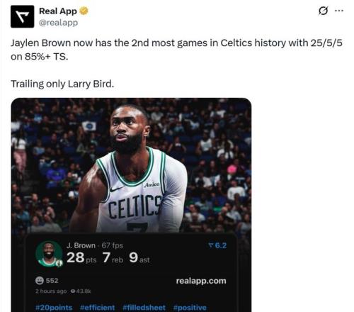 这是杰伦布朗生涯第4次单场以85%+的真实命中率拿下至少25分5板5助,成功追平队史名宿皮尔斯并列绿军队史第二,仅次于拉里伯德的5次。