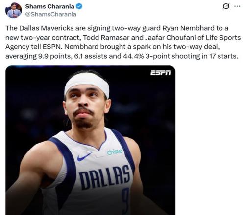 随后独行侠队记Rob Murrows跟进确认消息真实性,并且曝出独行侠已经告知瑞安-内姆哈德将转正他的合同。