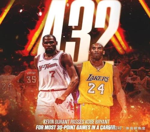 今日,杜兰特鏖战37分钟,20次出手命中12球,其中三分球8投2中,罚球更是无一失手,6罚全中,最终斩获32分、8次助攻、5个篮板以及2次封盖。遗憾的是,杜兰特此役虽个人数据耀眼,球队却未能取胜,真可谓“里程悲”。此役过后,杜兰特职业生涯中得分30+的场次累积至432场,成功超越科比,独占NBA历史30+得分榜第五席位。近六场比赛,杜兰特场均贡献29.3分、6个篮板和5.8次助攻,投篮命中率高达54.2%,三分命中率也有37.2%,状态正佳。
