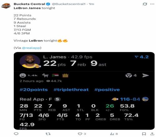 但实际上詹姆斯在湖人116-84领先勇士后就被换下场,全场比赛28分钟,13中7,三分6中4,罚球5中4,拿到22分9助攻7篮板1抢断,命中率53.8%,三分命中率80%,真实命中率72.4%,正负值+26。