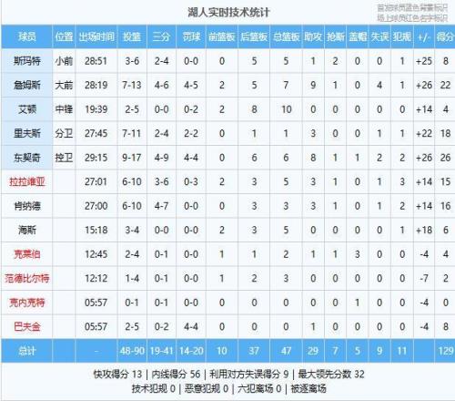 休息归来湖人彻底接管比赛,东詹里三人组三节合砍64分,仅比勇士全队少8分,湖人也在第三节将优势扩大至30分以上,巨大分差也让末节早早进入练兵时间。最终,湖人客场129-101大胜勇士结束3连败。
