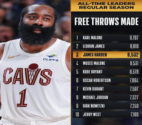 骑士对阵篮网的比赛,哈登缺席2场之后迎来复出,他在下半场也是找回状态,全场拿到22分9篮板8助攻,帮助球队有惊无险赢下比赛,终结了2连败的颓势。而在这场比赛哈登也是迎来里程碑,生涯总罚球命中数来到8535个,超越摩西·马龙(8531个)升至历史第3,接下来将追赶排在第2的詹姆斯(8810个)。