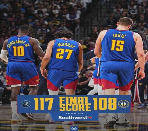 西部前四的卡位战,掘金掉队了。今天他们108-117不敌森林狼,遭遇两连败,下滑至西部第五。约基奇全场26投15中,轰...