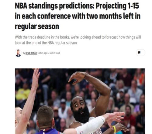 一数据导致火箭队跌至第5被看衰!在全明星周末即将到来之际,美媒《cbssports》根据剩余赛程难度、阵容升级程度、近期表现、摆烂计划等诸多综合因素预测公布东西部常规赛最终排名,其中湖人6、勇士8,得到哈登的骑士将飚升至东部第2。