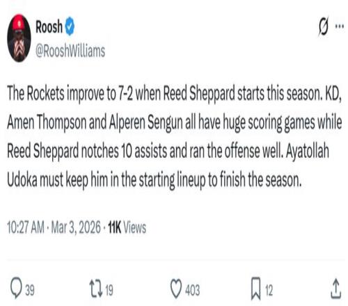 另外一名火箭媒体人RooshWilliams也给出相同看法:“谢泼德送出了10次助攻,很好地组织了进攻,乌度卡必须继续将其留在首发阵容中直到赛季结束。”
