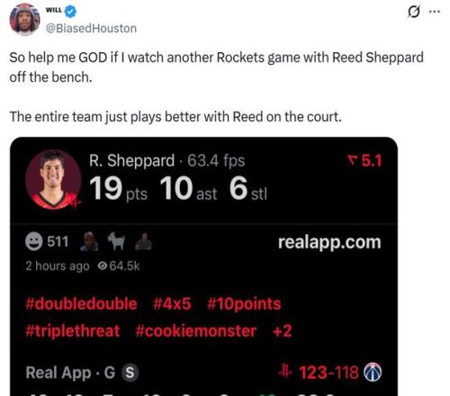 火箭媒体人BiasedHouston也果断发文力挺谢泼德:“如果谢泼德再替补作战,我绝对不会再看火箭队比赛,他在场时火箭队表现明显更好。”