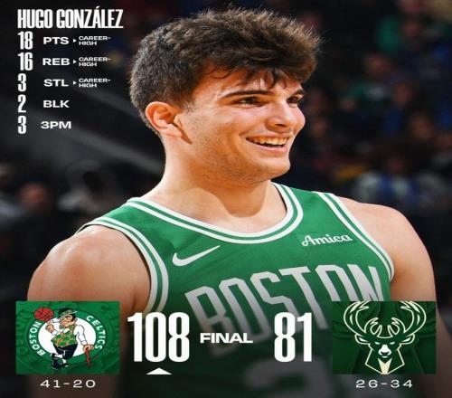 凯尔特人客场108-81大胜雄鹿,杰伦-布朗缺席,新秀雨果-冈萨雷斯顶上了首发。