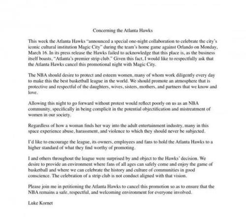 今天,马刺球员科内特在他的社交媒体呼吁,让老鹰取消他们刚宣布的主题日“魔术之夜”活动,称该活动对女性不尊重,因为Magic City是当地一家服务名流的脱衣舞俱乐部。