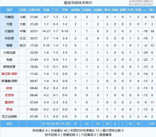 易边再战,约基奇延续火力,连投带罚拿到9分苦苦支撑,但尼克斯全员爆发持续发力内外开花牢牢占据场上主动,掘金后劲不足,尼克斯越战越勇不断扩大领先到30分开外。第四节尼克斯依旧没有给掘金一点机会,最终全场比赛打完掘金主场103-142惨败尼克斯!