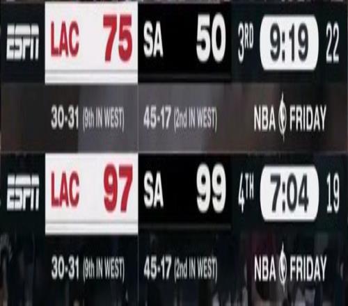 但是,快船第三节开始被马刺一直追分,第四节最后6.8秒,犯了两个巨大的错误。