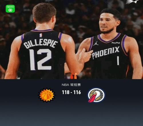 第四节太阳德文-布克拿下7分,鹈鹕德章泰-穆雷拿下10分,最终太阳118-116战胜鹈鹕