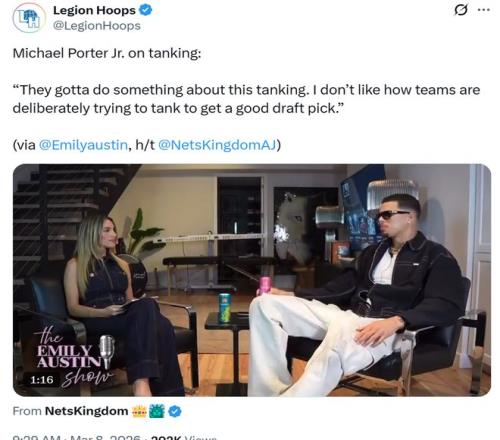 赛后他也公开炮轰本赛季联盟风行的摆烂行为:“联盟得对这种摆烂行为做点什么了,我很讨厌一些球队为了拿到更好的签位故意摆烂输球。”