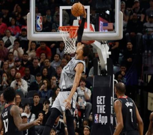 伊森上半场被文班排球扣杀,卡佩拉下半场被文班脚不离地按下,马刺的反击。