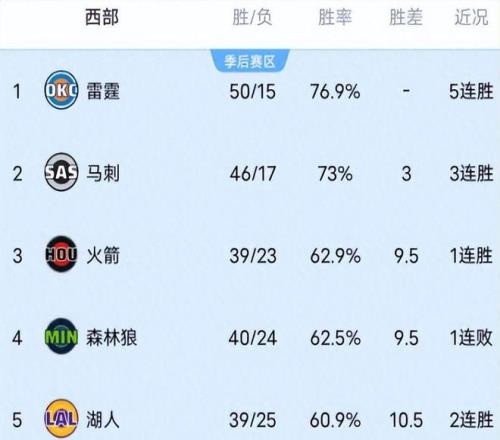 当前前六格局已然清晰:雷霆高居榜首,马刺稳守第二,火箭、森林狼、掘金、湖人四队缠斗不休,彼此间胜场差微乎其微,每一场对决都有可能重塑整个季后赛生态。