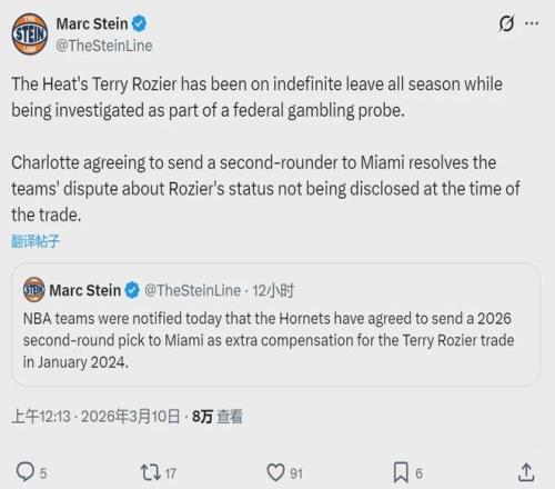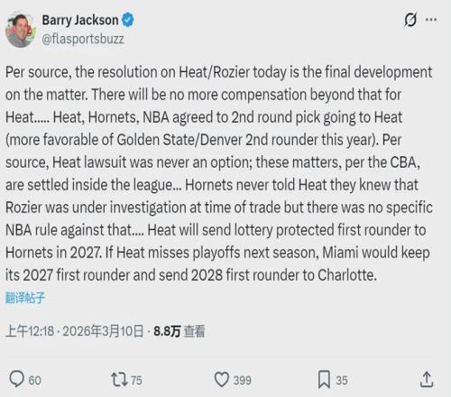 北京时间3月10日,据NBA名记Shams和Marc Stein报道,NBA联盟的各支球队今天接到一个通知,黄蜂队已经同意将2026年次轮签送给热火,作为罗齐尔的交易补偿。这个次轮签是掘金和勇士顺位更高的那个,目前预计是勇士的次轮中段。