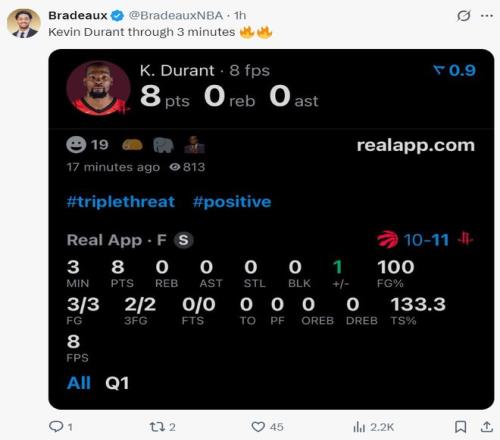 37岁的杜兰特继续被啃老,在申京状态无比低迷的情况下,开场3分钟里杜兰特一人拿到8分,首节杜兰特7中5+三分2中2,拿到12分1篮板1盖帽,杜兰特的个人状态就是火箭的基本盘。