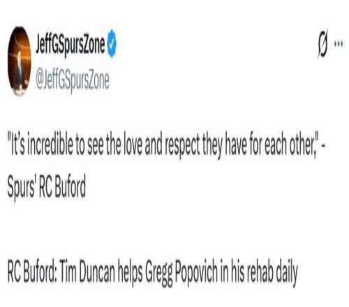 马刺CEO布福德近日做客法国节目《FirstTeam》,谈到了波波维奇的恢复情况、邓肯每天的陪伴。“波波维奇康复路上最动人的一点是,蒂姆每天都在球馆陪着他,”布福德说,“当吉诺比利、帕克或迪奥从外地回来时,也会一直陪在他身边。能看到他们彼此之间的爱与尊重,真的太不可思议了。”