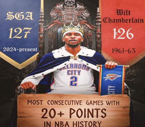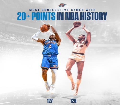 SGA在谈到打破这项纪录时却显得异常淡定,他表示:我打球过程中不看数据,听到球迷欢呼才知道自己破纪录了,我每年都在丰富技能包,这一切都是为了上场赢得比赛,如果赢不了球,我取得的任何成就都毫无意义。SGA绝不是说说而已,他确实是这么做的。据NBA官网数据统计,这127场20+比赛期间,雷霆队战绩为103胜24负,胜率高达81.1%,SGA总正负值高达1463,场均正负值达到+11.52。