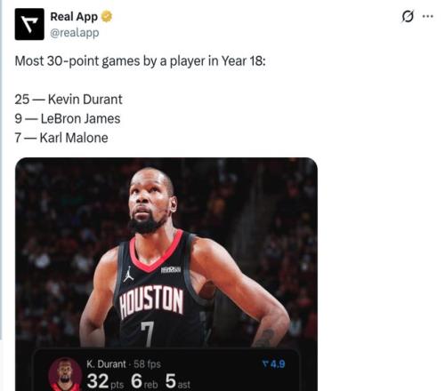 这也让杜兰特在生涯第18个赛季第25次拿下30+得分表现,断档排在NBA历史第一,詹姆斯以9次排在第二。
