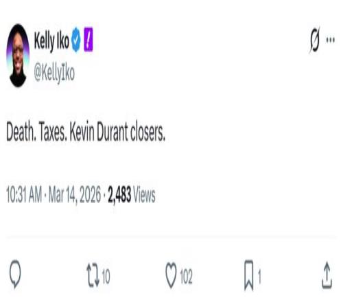 面对杜兰特这样的表现,火记Kelly Iko感慨道:“无法避免的三件事情:死亡、税收、杜兰特终结比赛。”
