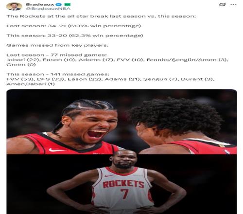 火箭记者Bradeaux晒出了一项数据对比,他认为杜兰特的加盟并没有让火箭更坏,火箭本赛季的战绩没有达到外界的理想预期跟伤病有关。