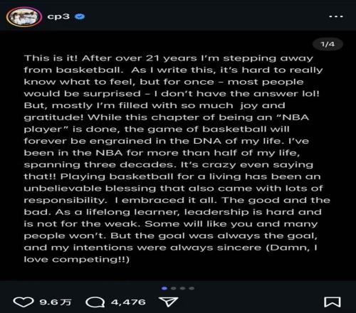 北京时间2月14日凌晨,40岁的NBA名人堂球员克里斯·保罗在其个人社交媒体上宣布正式退役,结束其21年的职业生涯。