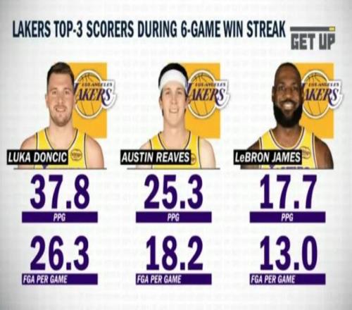 3月18日,目前湖人已经取得43胜25负的战绩,豪取六连胜,排名西部第三,根据美国媒体统计,在过去六连胜期间,湖人三巨头表现出色,东契奇场均贡献37.8分,里弗斯25.3分,詹姆斯17.7分。