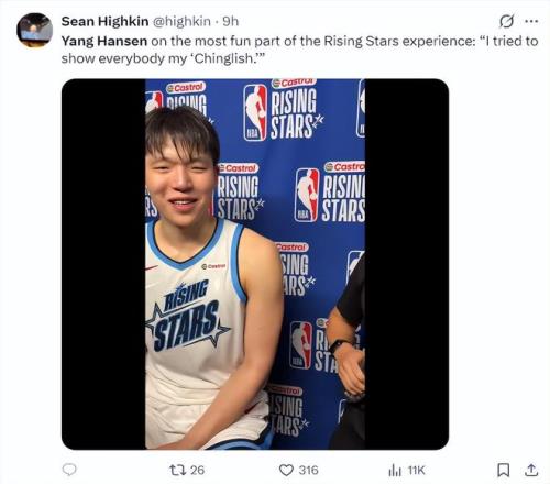 杨瀚森还谈到全明星新秀赛最有趣的部分是展现自己的‘中式英语’。
