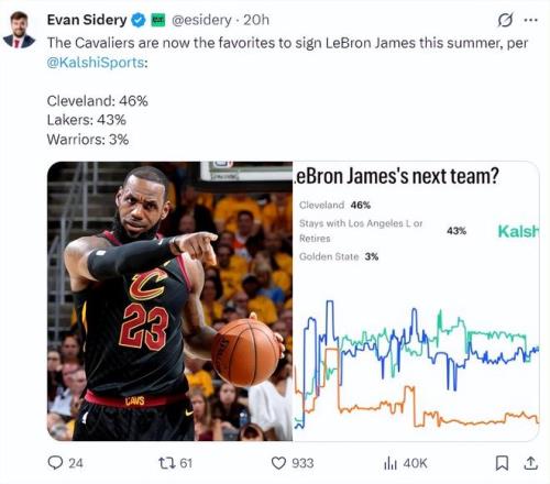 北京时间2月17日,《福布斯体育》记者埃文-斯迪瑞根据数据媒体Kalshi的统计曝出了勒布朗-詹姆斯今夏潜在下家的概率:骑士46%、湖人43%、勇士3%。