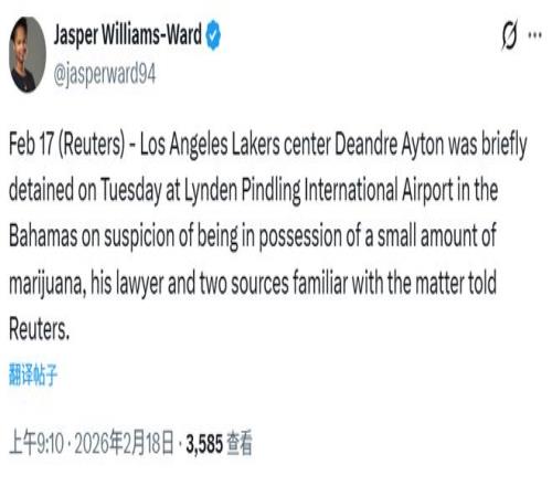北京时间2月18日,据其律师及两名知情人士向路透社证实,洛杉矶湖人中锋德安德烈-艾顿于今日在巴哈马林登-平德林国际机场因涉嫌携带少量大麻被短暂扣留。