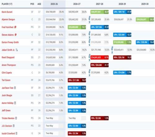 火箭队在今夏交易得到了凯文-杜兰特、卡佩拉,签下了自由球员芬尼-史密斯,除此之外还续约了杰夫-格林、亚当斯、范弗利特、泰特、霍勒迪等多人,这让火箭队成为了夺冠热门之一,只可惜范弗利特、亚当斯早早赛季报销。