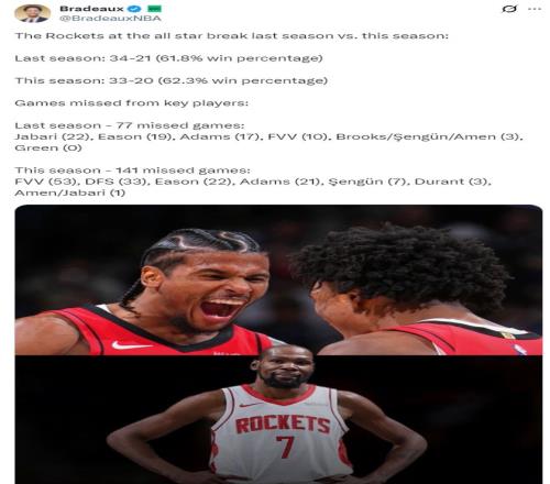 休媒Bradeaux晒出火箭队本赛季与上赛季全明星周末前的战绩,本赛季火箭队在多位核心合计伤缺141场(比上赛季多64场)的情况下胜率还略高一些(62.3%-61.8%)。